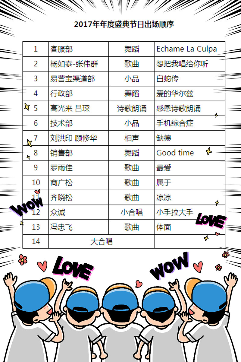 舞蹈、小品、相声、歌曲、大合唱总共13个节目!精心准备半个月,只为博大家一阵掌声、一阵笑声或一阵拥抱!展示的是风采、是气质、是情感、是美丽或是勇气!