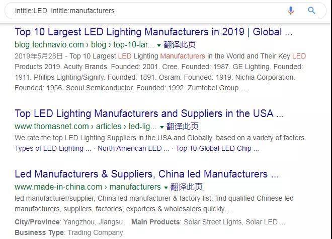 示例:intitle:led intitle:manufactures,即搜索网页标题中有led manufactures的页面。