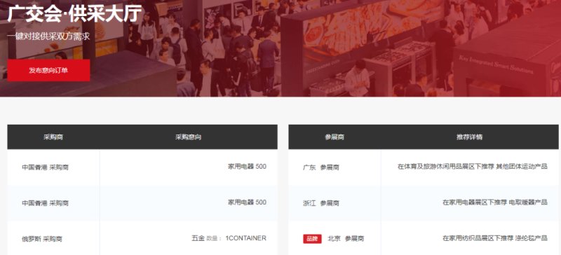 广交会官网设有展商展品、新闻与活动、全球供采对接、大会服务、跨境电商专区五大板块内容。