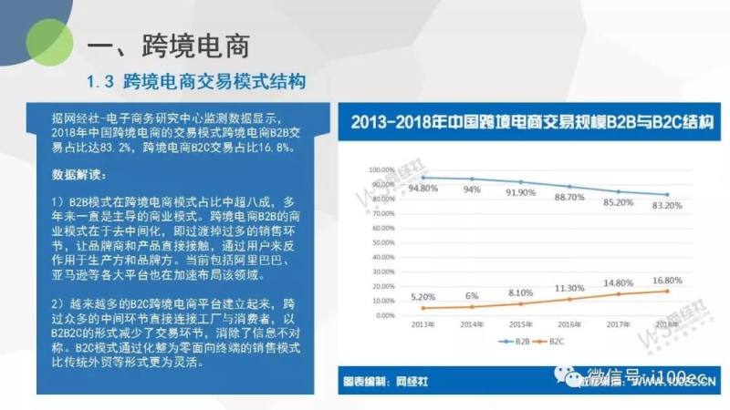 跨境电商交易模式结构:2018年中国跨境电商的交易模式跨境电商B2B交易占比达83.2%,跨境电商B2C交易占比16.8%。