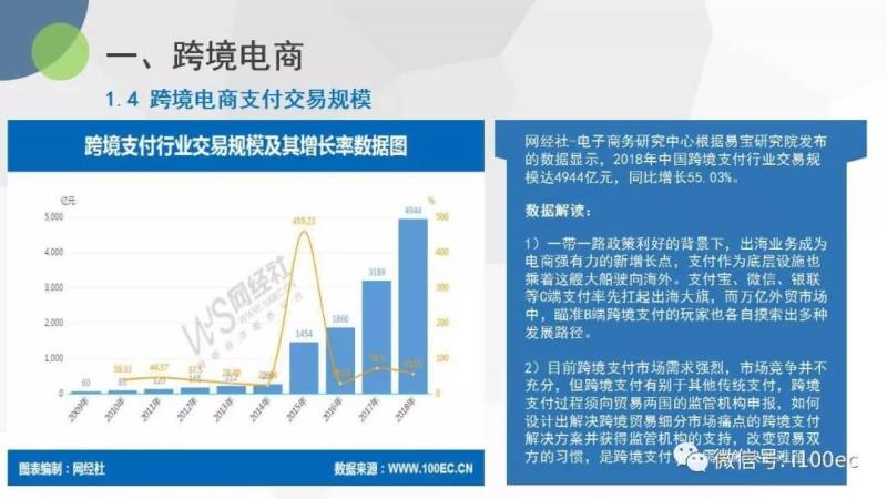 跨境电商支付交易规模:2018年中国跨境支付行业交易规模达4944亿元,同比增长55.03%。