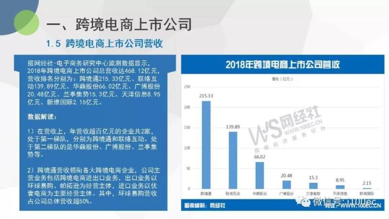 跨境电商上市公司营收:2018年跨境电商上市公司总营收达468.12亿元,营收排名分别为:跨境通215.33亿元、联络互动139.89亿元、华鼎股份66.02亿元、广博股份20.48亿元、兰亭集势15.3亿元、天泽信息8.95亿元、新维国际2.15亿元。