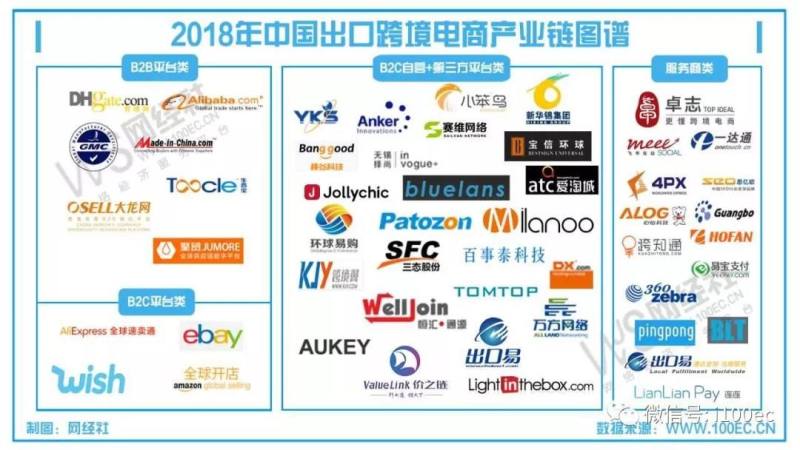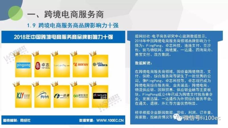 跨境电商服务商品牌影响力十强:2018年中国跨境电商服务商领域品牌影响力十强为:PingPong、卓志科技、连连支付、豆沙包、斑马物联网、跨境翼、一达通、四海商舟、易宝支付、浩方集团。