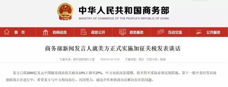 中国商务部新闻发言人今日(5月10日)就美方正式实施加征关税发表谈话称, 美方已将2000亿美元中国输美商品的关税从10%上调至25%,中方对此深表遗憾,将不得不采取必要反制措施。