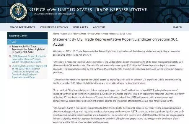 美国贸易代表办公室(USTR)声明官网截图(2018年7月10日)