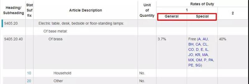 “1”中的“General”指从世界绝大部分进口产品的关税(含中国),“Special”指和美国有相关自贸协定国家的进口关税;“2”指和美国没有贸易关系的贸易受限的特殊国家(比如朝鲜)的进口关税。