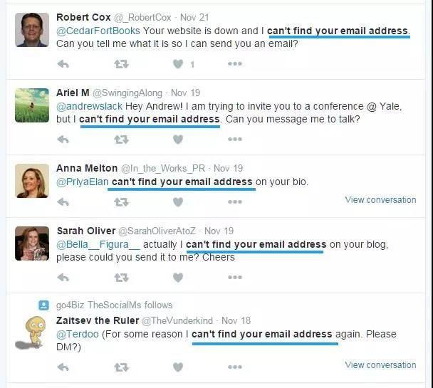 那么,找到这些电子邮件地址有多难?在Twitter上搜索“can't find your email address”,你就会明白了。每秒钟都有数不清的人找不到电子邮件地址: