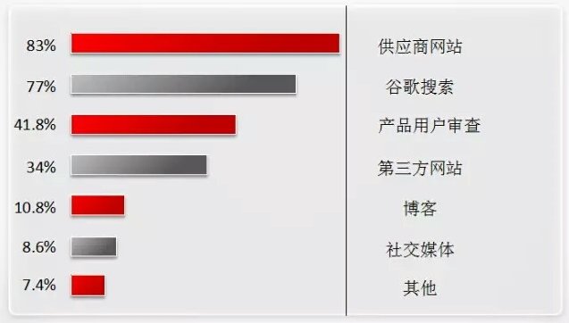 供应商的网站是最多B2B买家选择的价格对比渠道,其次是使用谷歌搜索引擎,第三是通过使用过该产品的用户反馈。