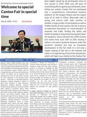 2020年5月26日,驻伊朗大使常华在《德黑兰时报》发表署名文章,题目是《欢迎参加特殊时期特别的广交会》。
